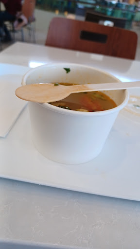 I was the only customer and the cook took 5 minutes to pour some cold broth into a cardboard bowl, add lumps of chicken and a very small number of vegetables without any noodles at all and microwave it.