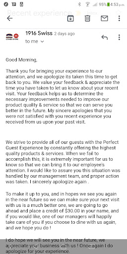 I don't want anything other than for Swiss Chalet to see this. I don't want a gift card, store credit or anything else. I want Swiss Chalet head office to see this and look into who is running this outlet because you have big...