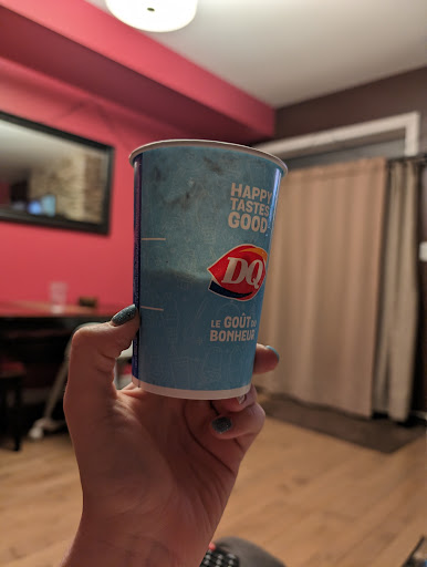When they were handed out, the first one was absolutely COVERED in sauce on the side of the cup. Before I handed it to the passenger, I reached into my centre console for some napkins (I always have extra, thank goodness) to wipe the cup off a bit. (And myself, since I was covered in sauce and peanut butter). While the young, unpleasant woman who already rolled her eyes at us can see me doing this, she doesn't offer me another napkin, or grab a cloth and wipe off the other blizzard that she is hanging onto. Instead, she shouts "HERE!" as she tries to hand out the second. I finish getting most of the sauce and peanut butter off of my hands, the cup, and my clothing, only to be fortunate enough to have gotten another cup that was absolutely doused in sauce on the outside, as well. I tried to ask the young lady for some napkins, but before I could do so, she simply walked away. No "thank you" no "here's a napkin" no "have a good night". Hands down the worst service I have received in...