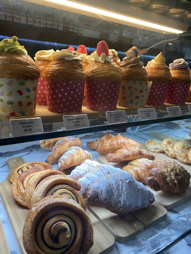 Their pastries were displayed beautifully behind the glass. Everything looked so good. We eventually ordered a Latte with oat milk, a London Fog with oat milk, a Lemon Meringue Cruffin, and the Supreme Matcha Strawberry Croissant.
