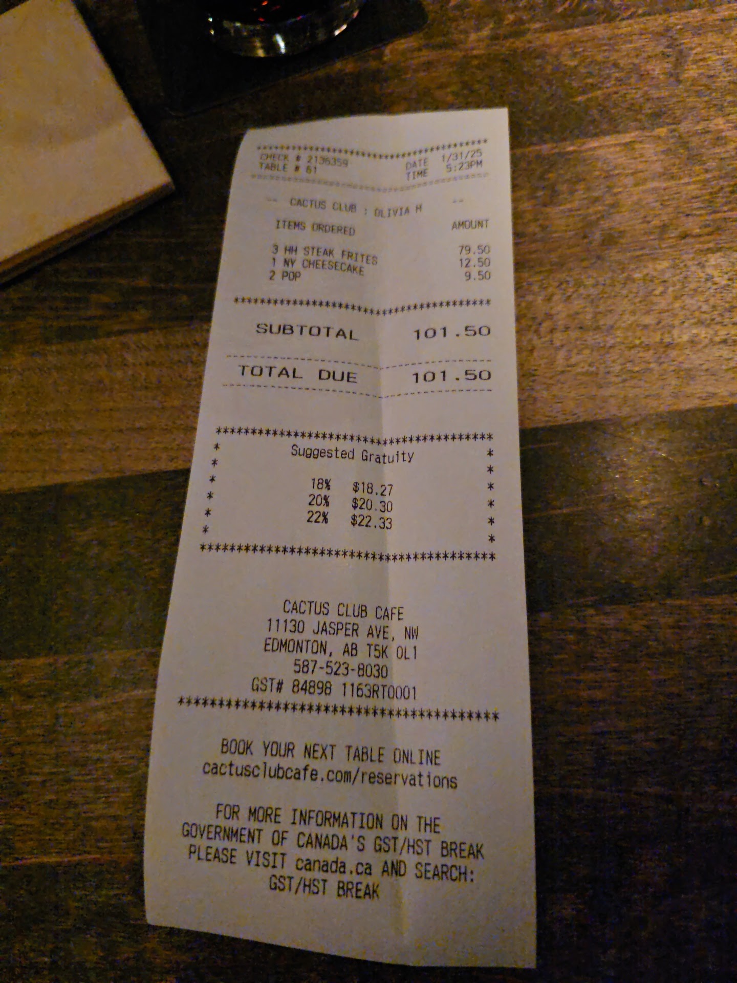 We chose to celebrate my dadâs birthday at Cactus Club on Jasper Ave yesterday. We were a table of 4. We chose Cactus because we took my dad about 6 months ago (albeit to the WEM location), and he loved it. I noted the birthday on the reservation, and also it was very apparent it was a special event from the birthday cards on the table.