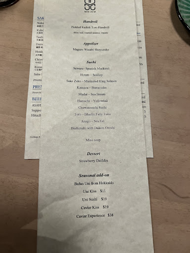 Read moreMSSM's omakase (I'll leave it up to you, Chef) isn't for everyone. The meal started with a small cup of sake to celebrate the 2nd Michelin Star. Followed by multiple nigiri (raw fish on top of rice). There were 2 extremely flavorful egg dishes with a lot of depth in addition to the best Miso Soup I've had in Edmonton to date and a very well coordinated strawberry mochi dessert.