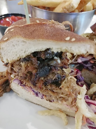 I had a pulled pork sandwich with onion rings and a beer. The pulled pork sandwich was fairly dry and flavorless. I asked for a side of bbq sauce and that helped a lot. They should consider just putting it on the sandwich as it comes. The onion rings seemed really dark as though they had been overcooked and were really tough, not crispy. I also got a couple that had the stringy outer skin of the onion rather than an actual piece of onion.