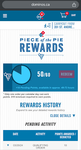 We have been patronizing Domino on 351 St. Andrew St W Fergus for a year now, mostly on Friday night and the experience with their products is great. I usually order online through my husband’s profile and get 10 points for every purchase of $10 or more, towards a FREE medium 2-topping pizza @ 60 points. Ordering online also affords me to see active promos/coupons to apply for a discount. I order and track the process online, and go to the store for pick up. In all, products and service are awesome at...