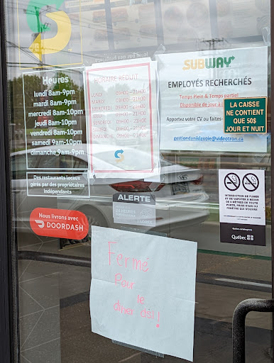Note that this review reflects my experience at this particular outlet and may not be representative of other Subway locations. But to mention they didnt have name tags that A quebec law breaching the law providing worst customer service! The manager was available but bailed out saying i finsihed my shift ! Nobody wanted to solve the problem ! Not to forget i...