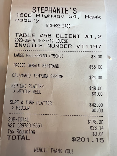 Read moreWent to Stephanie’s last night with a group of 12 people for a birthday party. Our orders were a mess from start to finish. Sides were wrong, courses came out in the wrong order and in general service was a mess. My wife ordered the chateaubriand, it came out on a plate that looked suspiciously like a surf and turf setup. Minus the surf! When we inquired as to why it came with roast potatoes and rice instead of mashed we were told it was a kitchen screw up. Am also quite sure it was a 3.5 oz instead of 7 oz. Our server was good she returned it to the kitchen to have it made properly. When it returned 25 minutes later the whole table was finished eating and the meal was not even plated correctly! Sauce was to be on the side, was served over top to hide the fact that they cut the meat in half! Plate was also served without mushrooms. When my wife asked if she would be charged for a meal that was made wrong twice and took over an hour to serve, our waitress said she would comp it. After eating a small amount, we asked for a box as everyone was finished and ready to leave. Our server came back to the table and informed us that the manager told her she could only comp it if she didn’t allow us to take it home. We asked to speak to the manager and he came to the table with what I can only describe as arrogance. When I asked about this decision, I was informed that all restaurants observed this practice. He was very combative and refused to have a civil conversation regarding my wife not wanting to pay for a meal she was unable to enjoy with our party. Having worked close to 20 years in the restaurant industry I explained that I have never seen anything like this. I also inquired about the decision to cut a choice piece of meat in half. To which he said that was the only way to cook such a large piece of meat to medium well. There were 2 other orders at our table. They were cooked medium and medium rare. YES! Both were cut in half as well. If you are going to spend close to $100 a plate on a meal. May I suggest you cross the river to the Chateau Montebello or drive just down the street to Le Vieux Chateau. Both restaurants would be happy to have...