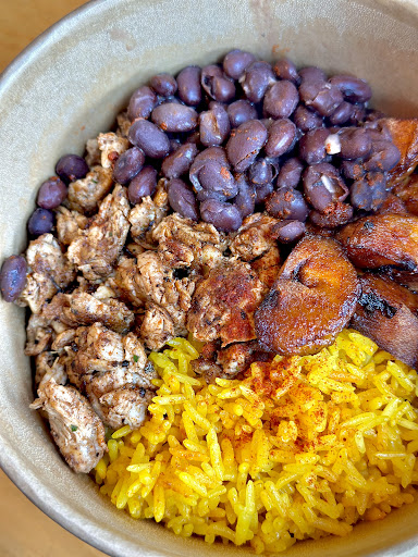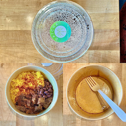 Have the Datcha bowl . It's a combination of coconut saffron rice, pigeon peas, sweet fried plantains and you have the option of chicken, beef or veggie. They would offer pepper sauce or spicy sauce ( say yes lol its delicious if you can tolerate) and the food is fresh off the stove! So it's just like eating a hot meal at home.