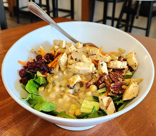 The first time we ate here I didn’t really understand the difference between a bowl and a salad. I ordered the Harvest bowl which had warm, brown basmati rice on the bottom with salad on top. It was a surprise to me and utterly delightful. I wouldn’t have thought of pairing warm rice with a salad, but it worked. The second time I had the Harvest salad which was lovely with chicken, pecans, cranberries, chick peas, spinach, carrot, cuke and greens with goddess dressing. It was fantastic. My husband had the Goddess salad with falafel, which with the chickpeas offered plenty of protein. We were both very happy with choices on both occasions. The salads are made fresh and the ingredients were very good. The salads are too large though. I fought to finish my way through it, and I noticed several other customers had left fairly good amounts of their salads in the bowls. It might be a good idea to serve a little less and reduce the price in line with the serving. In terms of staff, the first visit the lady was very friendly and the restaurant was clean. The second time a different lady, who was later joined by another employee, was just barely nice. The place was not as clean either (tables and floor). The restroom had not been tended to, paper on the floor and no soap in the dispenser, so it seems there are staffing issues. I would probably return to give it another chance though as the...