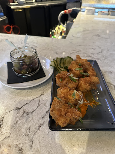 Hands down - the star of the show for me was the "bacon nuggets". It's actually pork belly, presumably deep fried in panko and then tossed in hot honey. I can't quite put my finger on the sauced paired with the bacon nuggets, but it was almost a cilantro type aoli. In my nibbles trio I also opted for the "millionaire fries" which are pave style potatoes (very thinly sliced and layered potatoes, cut into fry shape chunks) fried in duck fat. Paired with garlic aoili! Lastly, for my third choice I opted for the chicharrons, which are pork rinds tossed in a Cajun seasoning and paired with a spicy (mildly spicy) dip. Everything I chose in my trio is available for individual purchase and all under $10 per choice, however i opted for the "choose any three nibbles for $19 plus tax." My boyfriend chose the Salmon + rice bowl which was $23 before tax. He had no gripes about the bowl whatsoever. I dont have any opinions because I do not like mixed greens, cucumbers or salmon, which were all in the bowl. It smelled delicious and looked beautiful. He did say that the level of spicy, was also mild. Keep in mind, we are both fans of spicy foods.