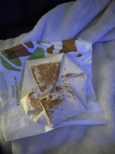 I open up my quesadilla bag to find that it's cut into 4 slices, one of which is about half of the entire quesadilla, the other 3 all of varying shapes and sizes. Whatever, it's not going to impact the taste. Took my first bite expecting Taco Bell bliss and the quesadilla tasted like bacon, not tortilla and cheese. I've never had a bacon flavoured quesadilla, I don't recommend it, even for people who like bacon.