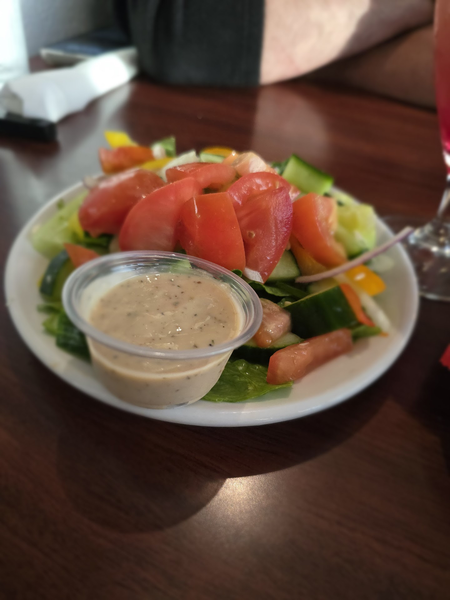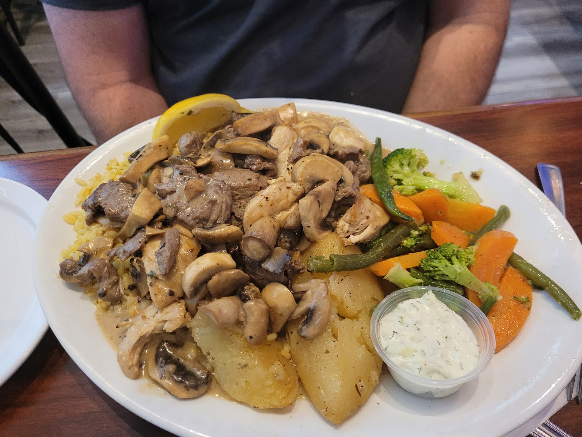 On to the main course, since we both got Greek entrees which included a soup of the day or salad of our choosing. My partner chose the tossed salad with the waitress's recommendation of their house Greek dressing. I'm not going to lie but she was right, the dressing was nice and zingy and it paired well with the fresh cut vegetables. I chose their soup of the day which was a tomato-based ham soup. It was nice a creamy but felt like it was lacking something. As well as the dill was a bit overpowering in presence but I'm sure others would enjoy. As the entrees arrived, we were met with large plates filled from end-to-end with food. Each cooked with much care as I tasted. One thing that perhaps my partner and I weren't used was the roasted potatoes. I tasted as though it was brined in a tzatziki based sauce before roasting so there was this slight off-putting sourness to the soft potato.