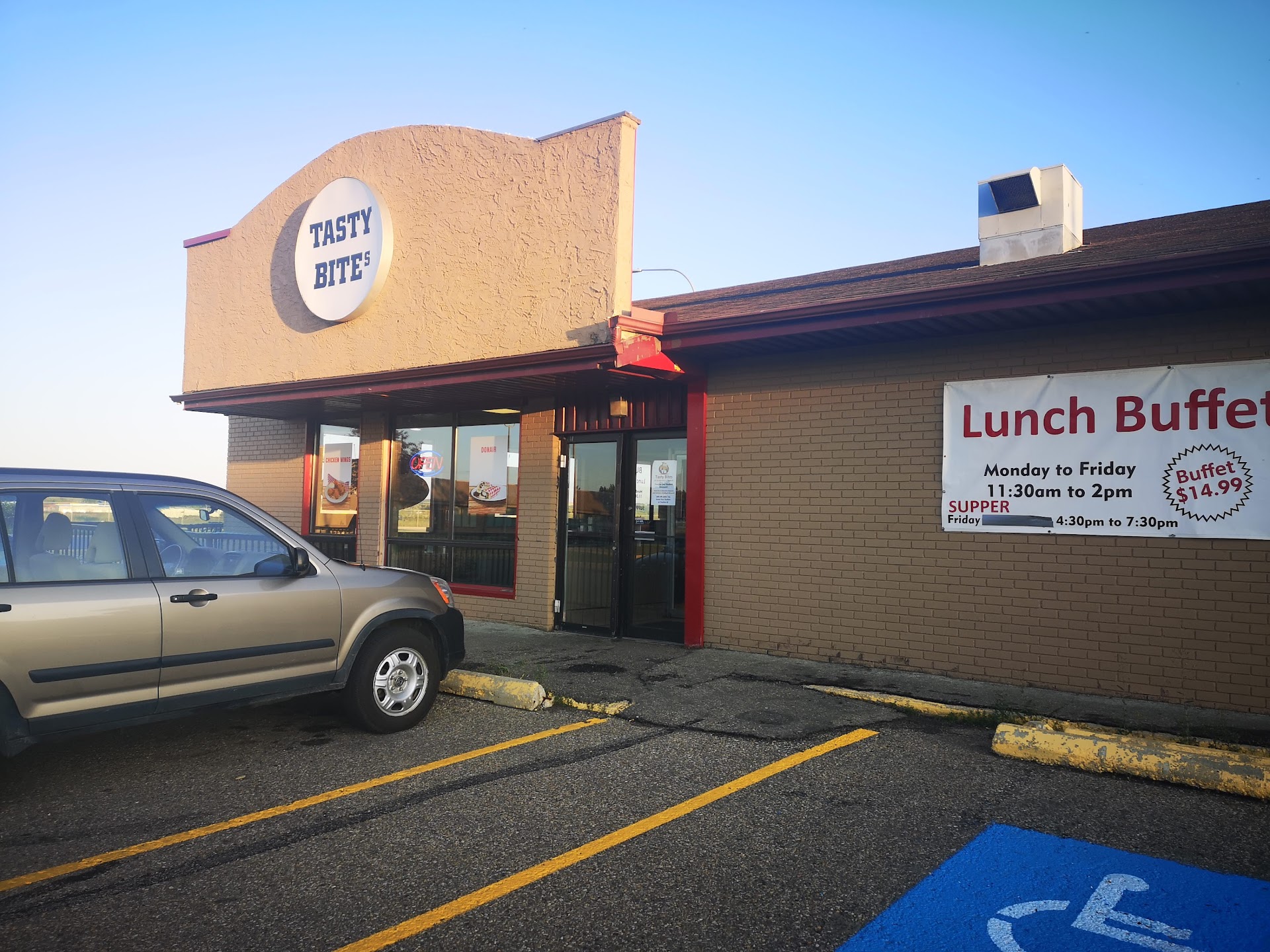 I had a lunch hour that was busy. I stopped at Tasty Bites as I have had eaten there before and it was always good. I can't say it was bad, but there were just little thing that bothered me. First it was shocking that No One was in there. The atmosphere, though clean was depressing with no customers. I'll assume they do more takeout? The service was okay. It was one person running the whole show. This lovely gal served me, cooked my meal and took my money. Literally there was No One there. That was kind of off putting. I looked around and saw the cooler cases that at one time were full were now empty. The rack that us used for the donair meat was not in use anymore. I ordered a donair burger, the closest thing I could get to a donair, despite the fact that there are photos of donairs on their windows. They still had their Wing Wednesday special on and it's Thursday. Not sure what the special was today, was not told. Didn't matter I guess. When I finally sat down to eat my lunch, I had a box with fries, they were good and a donair burger with cheese, lettuce, tomato and onion. It was tasty enough. But for $15.99 it could have had a bit more meat. All that aside, the thing that turned me off the most was I opened up the bag that this nice lady gave me with my food in and not cutlery, no napkins, no ketchup, nothing, no salt, pepper. When I ordered the burger she never asked if I wanted gravy, hot sauce or anything. As nice as the service was and the food was okay but a bit pricy for what you get, it will be a long time...