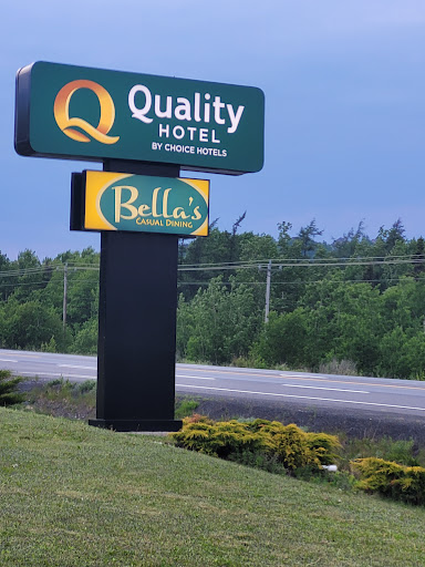 After a long, wet day of traveling, we had booked a room at the Clarenville Quality Hotel along the TransCanada Highway. We were pleasantly surprised that there was a restaurant within the hotel, as we travelled all day with no restuarant stop, and didn't relish the idea of hunting for a restaurant. Bella's was perfect! Great atmosphere, warm and welcoming. Definitely not your usual hotel restaurant!. Efficient and very friendly service. And the food was fabulous! Pan fried cod with scrunchions! Never had scrunchions before. The carrots and broccoli were cooked to perfect el'dente stage. The cod was great! The garden salad was perfect, not soggy. The spiced rum and Coke drinks we had (4) added up, were a bit pricey, but hey ... we were thirsty as well as hungry. But we also topped the meal off with dessert...delicious apple blossom & ice cream, and chocolate almond torte. The bill was $106 before tip, for the two of us, but having not eaten lunch ... we splurged and glad we...