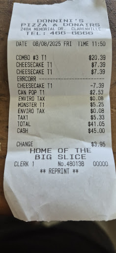 Read moreThe last time we ordered from Donini’s left a bad taste in our mouth; that was over 6 months ago. We decided we’d mix it up tonight since we were busy until later in the evening and give them another shot. It’s a Monday night, I placed my order at 8:16PM, it is now currently 9:38PM and we literally just watched the delivery guy show up. Almost an hour and a half to have pizza delivered less than 5 minutes away? We asked for the pizza to be well done, and after waiting an HOUR AND A HALF ON A MONDAY NIGHT, the pizza dough is raw! Imagine that! I don’t even know how people defend this place or bother wasting their money, the food is definitely not worth the money...