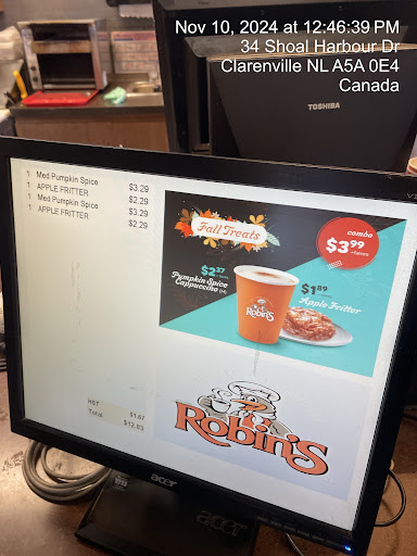 people are not trained. They don even know the promotions and specials or what you sell. I came at 12:45 for a combo which is advertised on the screen in front of the cashier. It was a "Fall treats" of a pumpking spicy capuccino and an apple fritter for $4.99 and they 5.58 plus tax. When I mentioned the special and I even showed it they just said that they "don't know how to do it". Btw: the apple friter was dry and bad compared to other Robins. Coffee...