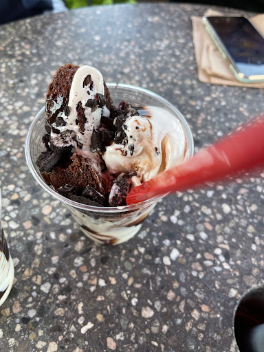 The restaurant is very clean creating a pleasant environment for customers to enjoy their treats. The overall atmosphere is great, making it an ideal spot to relax and enjoy your ice cream. Furthermore, ample parking space is available, adding convenience to your visit. The presence of excellent outdoor seating further enhances the experience, allowing us to enjoy our ice cream in the open air.