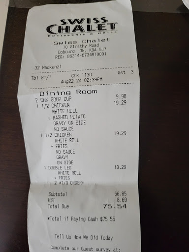 Of all the Swiss Chalet restaurants we’ve used for a quick and dependable 1/4 chicken, white meat & fries or mixed vegetables, this location is one we will definitely strike off our list. We arrived at 4:43 pm (we were watching the timing as we were driving onwards to north of Trenton). We were seated within 5 minutes. Then we just waited, and waited, and waited. Very unusual. We had to twice “hail a waitress” to take our order but that didn’t work. Finally we called the hostess over and eventually a waitress appeared, took our order and we continued to wait. We, again, asked two different waitresses and the hostess when we’d be getting our meals served. Dinner arrived at 5:24 pm. We’d walked in the door at 4:43 pm. We were not at a fancy restaurant where one lingers over a pre-dinner drink. Our plans had been to be back on the road by 5:30, not just starting to eat. Needless to say, we had to rush through our meals which was not an enjoyable experience and leave about half on the plate. We had a concert to attend and we literally made it to that venue just as the lights were dimming. Never again will Swiss Chalet Cobourg be our on-route stopping spot. We’d both agreed after we’d driven away that we should have just gotten up and walked out. The location was so handy; minutes from the 401 and about halfway to our destination. As a parting jab to the restaurant, we voiced our negative woes to several new customers, both standing in line and those outside heading to the doors. “Terrible experience; had to keep asking to be served; when will we be getting our order”. I did feel it was appropriate to leave our waitress a tip as it was not her fault so why take it out on her. But on the debut machine where the question we always answer with a positive “Yes”, this time we easily hit the “No” button. No, we will not recommend this location, No we will not be back next month, No, we did not appreciate the long wait, No, the service was not up to Swiss Chalet’s standards, No, we did not get value for our money. No, it was not an enjoyable experience. I see by the other recent customer reviews that this seems to be an ongoing trend at this particular location. We did dine there back in June as we were making our way to the same entertainment venue and next month we make a repeat journey. June’s experience was good, quick reliable service. September was just the opposite. We’ll avoid this locale in October & head for fish & chips instead. Swiss Chalet Cobourg could learn a lesson from their Whitby or Oshawa counterparts. Keep the customers happy and they’ll be back ... and they won’t take the time to go online writing their negative willies. Usually I’m the one writing letters of commendations for great customer service. Not this time...
