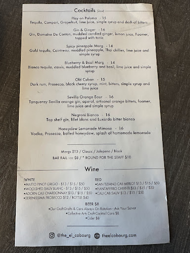 Read moreI've been to the EL Cobourg a number of times, and each time both service and food was consistently stellar. Among the sea of franchised restos, this gem is the kind of European dining experience I'm after. The wait for good food well prepared, rather than banged on a grill from the freezer, has never been overly long when I've been there. The service every single time has been wonderful. Chill, relaxed interactions with wait staff who offer excellent recommendations on drinks to go with your food choices and who are attentive and friendly. They don't chase you out after your meal, even though they are often busy and fully booked. I find it interesting that many reviews refer to the expense of the food, Priced (slightly) higher than franchises, sure, but with so much more bounce for the ounce, it doesn't bear comparing. I aim to try everything on the menu, but the Truffle fries should be on the table always, Caesar Salad was perfect and the Fish Tacos are to die for. My pals and I now have an understanding the we will always order Fish Tacos to share, as an appetizer along with our mains. Cocktails and Mocktails are great, but I prefer wine and their beer selection is wonderful. I think they've nailed the whole vibe. Local biz values, happy staff means good management and they survived the pandemic closures, a phenomenal feat. I wish them years and years of success as I intend to keep them on speed dial! No pics this time, food was gone too fast......