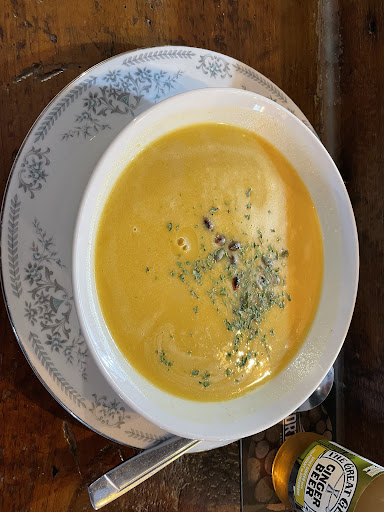 So the soup… a delicious butternut squash soup… I was looking forward to a hardy bowl of soup… not happening… this butternut squash soup was so delicate that I wouldn’t have know it was butternut squash, had I not been in the kitchen an hour earlier and saw Sous Chef obsessively blending it to perfection! The sweet carrot and the house veggie stock must have added to the magic!