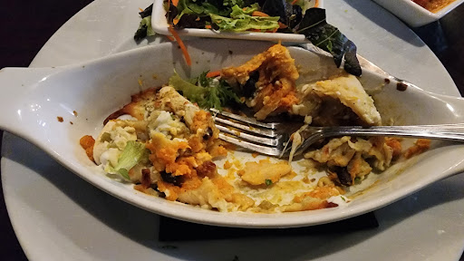 We ordered a bottle of wine and started our meal with a shared appetizer of brie with blackberries, peaches, ginger maple and citrus compote. It was supposed to come with Rosemary flatbread but it seemed to come with small pieces of pita bread with no rosemary. It was also the smallest piece of brie that we’ve ever been presented with. We probably should have sent it back but we could not find our server. There was only about l oz. or 30gr. of cheese. We each only got 2 very small bites from this $18.00 appetizer. For entrees my husband had Szechuan salmon and I had the steak and prawns. I tried a bite and it did not taste very good at all. My husband did not enjoy his salmon and thought maybe it was because of the seasoning but it definitely was not a good dish. My steak and prawns had overcooked prawns and one of the toughest steaks that I’ve had. It was very disappointing. When my husband commented to our server that the food was very disappointing she provided us with a complimentary dessert. We chose key lime pie and it was decent.