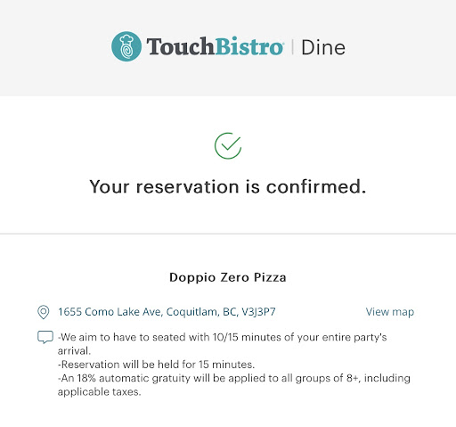 Read moreI had made a reservation January 16 for a table of 14 to 16 people for February 4 and I received a email confirmation that it was confirmed. The day before our reservation I receive an email saying that our reservation has been cancelled. I had called as soon as they opened that Friday asking why my reservation was cancelled. they were saying that no visa was given for a reservation that large when no one has asked me for a CC number to do this which would’ve been no problem. They had said they had tried to call me but my phone never rang my phone number was on the reservation . After some back-and-forth they kept our reservation. So we all order our food and drinks and start our meal. 90 minutes into a reservation the server comes up to us and says your time limit is up for your reso. Most of us were not even done meals I said this is a joke 2 hours is the minimum what I was told. Our reservation was supposed to be from 6 PM to 8 PM. We were treated well by the staff but we’re continuously getting looks to get out. Most of us did not even get to finish our drinks or get to even order a dessert by being asked your time is done. One of the Servers actually asked us if we wanted to go cups for our alcohol. this is crazy!!!! What kind of legal problems this could bring!! Now On to the food. It was mediocre at best. The pizza was bland and soggy for all of us. only good dish was one of the pastas we had. Most of us that were there that evening have friends or relatives in the restaurant business and this place was so disappointing for the way they run it. Never been kicked out of a restaurant without finishing drinks. Very disappointing I would’ve given it a doppio Zero (00)...