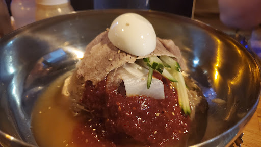 We also ordered their cold buckwheat Korean noodle soup which I think is their best dish. The flavor taste a bit sour, since they've added the sweet and sour radish along with a few slices of tasteless beef, shredded cucumber and half of full cooked boiled egg on top. Personally I like the light taste and it feels refreshing if you don't like to eat too much meat.