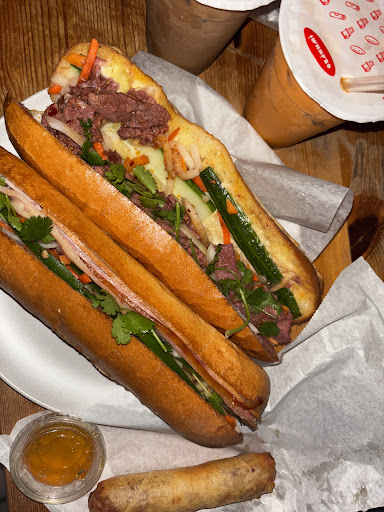Read moreI got a satay beef and deluxe classic with a Thai milk tea and Vietnamese coffee for $37. The drinks were okay (no straws???) the Vietnamese coffee was a kinda watered down for my taste cause of all the ice they put in. Thai tea was really sweet, tasted like melted ice cream, there is a hint of tea. Satay beef was very sad looking bĂĄnh mĂŹ (+$0.50 for a measly smear of pâtĂŠ, it was like they just wiped off whatever was left on the knife on the bun) Deluxe classic was good, not much else to say about it. Almost forgot about the spring roll, they tried to sell the combo so much but itâs basically the price of a sub + spring roll + soda you donât save anything? Also only two of their bĂĄnh mĂŹ have pâtĂŠ like isnât that what makes a bĂĄnh mĂŹ a bĂĄnh mĂŹ? Maybe I expected too much, high-key more worth drive to Duffins for bĂĄnh mĂŹ and Thai tea. Lastly, this was lowkey cheaper (like $7) to order on UberEats and pick up than to buy in store⌠Sorry for...