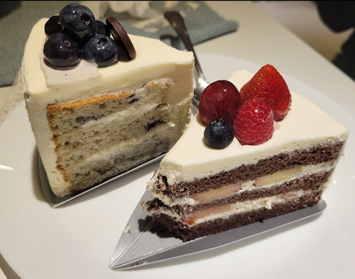 Starting off with the cake, my partner and I ate the first bite and the cream had an overly chemical flavor, weāre assuming it was some preservative to keep the cream shelf stable as it didnāt melt at all. The inside of her blueberry chiffon was just typical blueberry muffin box mix, but the chocolate strawberry cake was just dry flavorless and because the cake base was so unflavorful it became a vehicle for the creams chemical flavor aftertaste, we couldn't even choke down one bite and both had to spit it out.