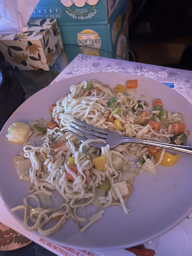 The meat was clumped together in thick layers of three, completely unseasoned on the inside, had a bad smell, and was so tough I had to spit some of it out. The noodles were covered in burnt crumbsāmost likely from the panāand were so bland they had almost no flavor at all. The vegetables felt more like scraps than actual ingredients.