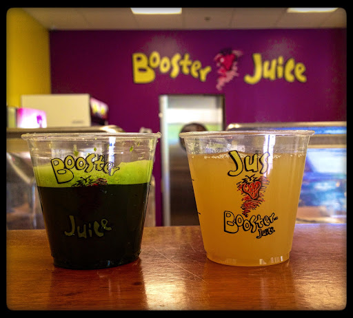 A few things to note: The few times we went here we were charged for a double wheatgrass shot and were not given other options. This is disappointing considering the last time we went we were given an option... by not giving us an option the first few times I am feeling like I am being taken advantage of which is poor business. Again, the first time we got the green juice you could taste all the ingredients: apple, kale, ginger, lemon. The last few times they've been predominantly apple, with the hue of green and little to NO notes of ginger and lemon. And, unforutnately, the last time our juice was brown, even the juice with the wheatgrass in it... I asked the employee about it and all she said was "I don't know." I left it as is, because what are you gonna do... but it's like maam... you made the juice, you clearly know how to make juice, so I am not sure why or how you didn't notice the normally GREEN juice is BROWN! and also... are folks just not adding lemon and ginger anymore? It is somewhat of an unpleasant atmosphere because all but the first employee have been not great... They aren't happy and appear to be annoyed when I ask for what I want... like... I am at booster juice to get something on the menu... I am not sure what the issue is. I hope the employees are treated well and better. I always think about working conditions, management, and owners when a team of employees have not great attitudes. So perhaps whoever reads this from this specific business takes that into consideration :) Finally, the last time I went here, one of my chipotle chicken wraps had a bone in it! I was leaving out of town so I couldn't go back and rectify the situation. But it was unpleasant. Thankfully, it was in one of my final bites, so it was not really a big deal. But it is worth noting. I assume the wraps are not made in house and or the chicken is coming from a package so it is out of this business' control. Just sharing my experience. I have had this wrap several times over the past few years and this is the first time this happened so its not a big deal. But given my comments above I thought I should share this too, since I am just letting it all out there.