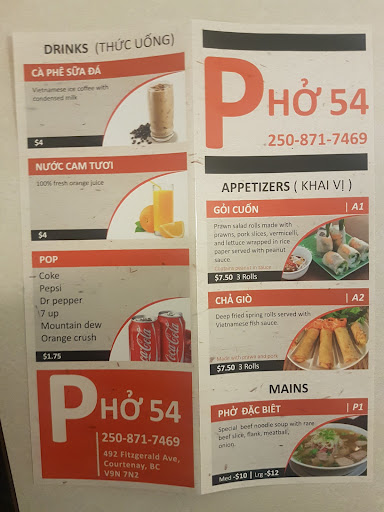 Read moreI just had a refreshing experience at Pho 54 in Courtenay BC. I was having a senior blur vision day and tried to pay with the credit card machine. I typed in the wrong amount and ended up giving a very large tip. I would not have noticed it and left. They lovely young lady asked if I was sure if I wanted to leave such a tip? We sorted it all out and I told her I was proud of her honesty. So nice to see good honest people in this day. I will go there again next time I...