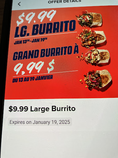 Food is expensive these days. I'm always hunting for a bargain. I downloaded the Quesada app like they beg you to do. The app showed me a special - $9.99 large burritos until January 19, 2025. It's January 17. No exclusions noted, no details provided. Sweet! I add a large burrito to the app, but the app says pay full price, you cheapskate (I added the colour commentary). No code to enter at checkout, no details. The attached photo is all the details provided by the app (after you click for more details). So I go into the restaurant. The clerk says nope, no $9.99 large burritos in store - you have to use the app. I explained that the app charges full price and I show her the ad. Then a lot of shrugging of shoulders - maybe you need so many points, maybe "some" stores don't participate in promotions. Not sure. The owner/manager and staff should know about specials offered on the Quesada app, and the app shouldn't make vague offers and not deliver. This is not the first time this has happened here either. Not thrilled. Hence the review. Burritos are actually tasty if you're cool paying full price. Restaurant itself appears clean, and there's more seating than you might expect, but it's a pretty sterile (uninviting) place to...