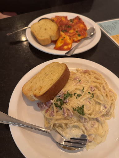 The meals came quickly, were hot and tasty. We had Mushroom/Chicken penne Alfredo, with big chunks of mushroom and tasty chicken(obviously homemade), and house soup(hot and flavourful) and Ravioli with bolognes. He brought my husband extra chili flakes and Parm!!!