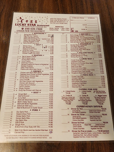 Read moreWhile spending the night in Cranbrook my partner and I decided to venture out and try the local Chinese food. Definitely glad we stopped by at Lucky Star. First I found the restaurant to have that small town classic Chinese feel with dĂ©cor and atmosphere, I really enjoyed that. We started off with a staple dish in my opinion, the Wor wonton, the wonton were very tasty and generous with the portions, I was quite happy with the soup. For our mains we ordered the sweet and sour pork, shrimp egg Foo young, and spicy squid. The star of the three was definitely the egg Foo young, really appreciated the staff not adding the sauce on top and leaving it on the side, my partner and I really enjoyed the dish sans sauce. The sweet and sour pork was quite good , a bit dry but not bad, sadly the spicy squid wasnât too spicy and I found the batter was a bit much and a hint sweet, I think next time I would like to order the crispy noodles in place. All in all a good experience , if your looking for a good western Chinese dinner I...