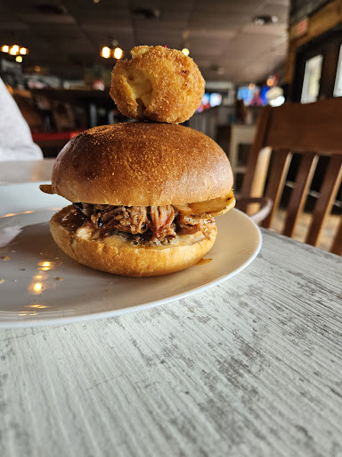 B3A Burger 6-oz beef burger topped with slow maple-smoked pulled pork, crispy jalapeno-cheddar-spiced house potato chips, and smoky honey mayo on a classic burger bun with a bite-sized crispy mac ‘n’ cheese fritter.