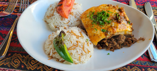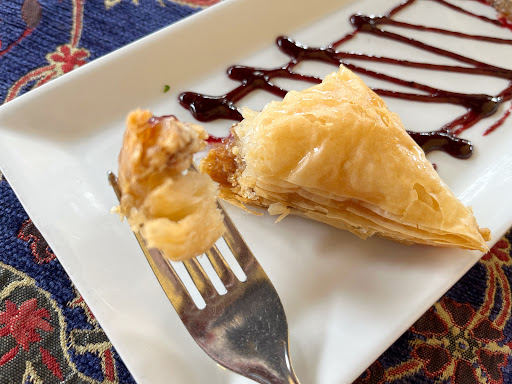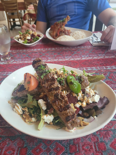 Original review: Lovely Mediterranean restaurant with exceptionally beautiful tablecloths and a nice ambiance. We ordered the beet salad (beets, walnuts, goat cheese, maple vinaigrette) and the mixed meze plate which included hummus, dolma, mutabbel, falafel, and eggplant saute. For dessert we had the baklava and liked it so much we also got an order to go. The baklava at the table was served with a delicious raspberry sauce.
