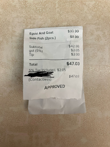 Read moreFlavour is good. Vibe is good. Can do better on menu pricing clarity. I dined in and ordered Egusi with goat. There is no mention on the menu anywhere or by the server there’s an up-charge for goat. Was surprised when settling the bill as a result didn’t tip the usual amount. Could be they are still working out kinks in their operation given they recently opened. Advised server to please make sure additional charges are either stated on the menu or mentioned. Will update this next time I visit see if they have taken...