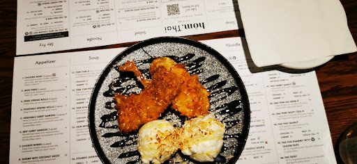 Read moreAmazing Thai food and outstanding service !!! The servers were very attentive and the food came quick. Shortly after getting our meals the chef came to ask how the food was which was a nice touch. The food was fresh, ingredients were so flavorful. I forgot to take a pic of the meal but we had the beef curry samosas (#6), chili beef fried rice (#19) and shrimp pad kee mao (#33) followed by coconut deep fried banana with ice cream for dessert (as shown in the picture). DO NOT SKIP THIS DESSERT! It was DELICIOUS 😋. The samosas were small but packed with flavor. The main dishes were large portions, and just the right amount of heat. We left feeling full and satisfied. My boyfriend is from NYC and compared it to the best Thai in NY. Moncton needed authentic Thai food and Hom Thai delivers. This is a must try and I look forward to going back to try other items...