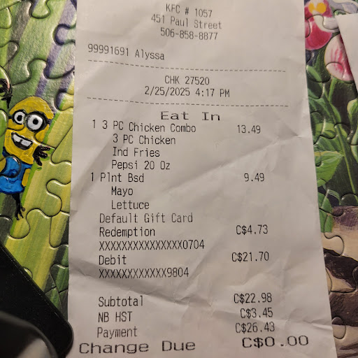 Read moreI had such a wonderful experience at KFC store dieppe that I just had to share. From the moment I walked in, the place felt welcoming. The staff greeted me with a smile and handled my order with professionalism and speed, even though the store was quite busy. It’s clear that customer service is a priority here. The restaurant itself was clean, well-lit, and organized, which immediately gave me confidence in the quality of food being served. Tables were tidy, the counters were spotless, and I even noticed staff regularly checking and maintaining the dining area. Now, the food absolutely delicious. The chicken was piping hot and delicious, golden, and perfectly crispy on the outside while staying juicy and tender inside. It had that classic KFC flavor that never disappoints. The fries were fresh and crunchy, and the sides were just as satisfying. Everything tasted fresh and was served at the right temperature, which really made the meal enjoyable. What stood out most to me was the balance of speed and quality. Even though there was a steady flow of customers, my order was ready quickly without compromising taste or freshness. That kind of consistency is hard to find, and it’s one of the reasons I’ll keep coming back. Overall, this KFC store truly exceeded my expectations. Great service, a clean and comfortable environment, and delicious food all in one place. I highly recommend this location to anyone looking for a quick bite that doesn’t...
