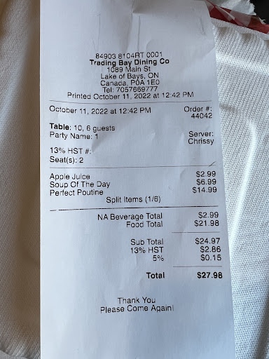 At 5:30pm, it was well beyond 15 minutes so returned to see where we were on the list. The party in front of us on the list had been seated, and Martin told us "just a few minutes longer." So we waited, and then continued to see people come by and ask him by name for a table (without reservations) and Martin found a table for them. Whether they were people who were staying at his parents' B&B or simply friends, he was definitely doing favours for all of them. After pointing this out, Martin told us that "it wouldn't be much longer" and to go have a take-out drink around the other side of the restaurant. We did, and in the 1.5 additional hours that we waited to be sat, we inquired again with him how much longer and were told "just a few more minutes" and we were "next on the list." It was the most appalling customer treatment that I have ever experienced. By 7pm, we were fed up and left and went to nearby Pizza on Earth for a fantastic meal with excellent service. Now, that place I will give 5 stars to -- as for Trading Bay Dining, unless you enjoy politics, bribery, and being treated very poorly, I would steer clear. I appreciate the response from the restaurant, but since there is no place to reply to that comment, I will reply here. The issue is not that reservations were full, the issue is that the person you have running the front of house has no concept of how to manage customers' expectations. Don't tell customers "just a few more minutes" and "you're next" when you can see that the wait will actually be considerably longer. And certainly, don't let other folks in who clearly don't have reservations ahead of waitlist people. Customers should be given realistic estimations so that they can make their own decisions. Someone who is told "just a few more minutes" will certainly wait for a table, someone who is told "it will likely be 45 minutes or more" can then decide if that's workable for them. Managing a customer's expectations should be the first skill that any good front of house employee should have, and in this case, that skill is...
