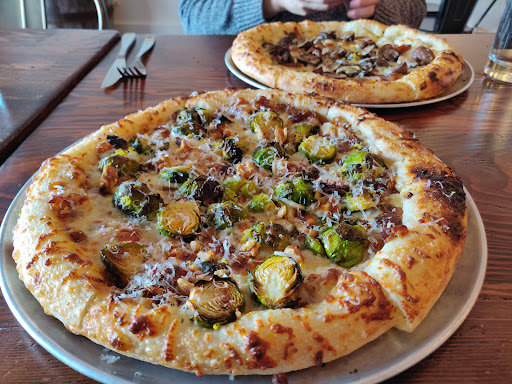 We decided on getting the fried chicken, a mushroom, and a brussel sprout pizza. The fried chicken was plated nicely and smelled amazing. The chicken was crisp and still very tender on the inside. I just wish it was a tad crisper on the outside. I loved the pairing with grainy mustard, honey, and pickles. It was a well balanced dish and definitely something I would order again. The pizzas arrived and they're quite large. The crust looked and tasted good. It had doughiness and a crispness. I liked the brussel sprout pizza. It was a mix of sweet and savoury. The onion jam added a nice sweetness along with the honey. The added walnuts gave a nice crunch. I hadn't had a pizza like this before and was glad I tried it. Also, you can ask for chili oil. I thought it would come in a bottle that I could just drizzle on. However, it came in a little container with actual pieces of chilis in the oil. I really liked this and it added a nice kick to my pizza.