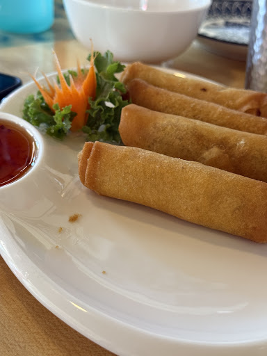 We ordered spring rolls, red curry, pineapple fried rice, and chicken pad Thai. For drinks, my dad ordered a coke, but I got a Thai iced tea (I felt adventurous). We got our orders taken, and within a few minutes, we got our drinks. The Thai iced tea had an appetizing red color with cream on top, and it tasted just like Boba tea. It was great.