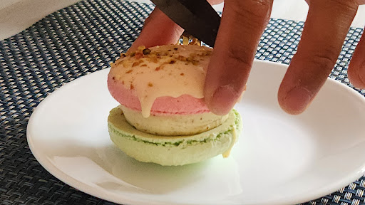 These macarons are the best macarons I have ever had. The baker knows what she is doing!! The first macaron I had was the pistachio-raspberry macaron and it was an adventure for the taste buds. First there is a tanginess coming from the coating, and then the flavour profile goes into a very mellow and sweet flavoured soft and semi-crumbly macaron, and it perfectly matches the flavour of pistachio. When I got to the cream, it was not too sweet, it was not too sour, and it had a layer of purees pistachio and raspberry.