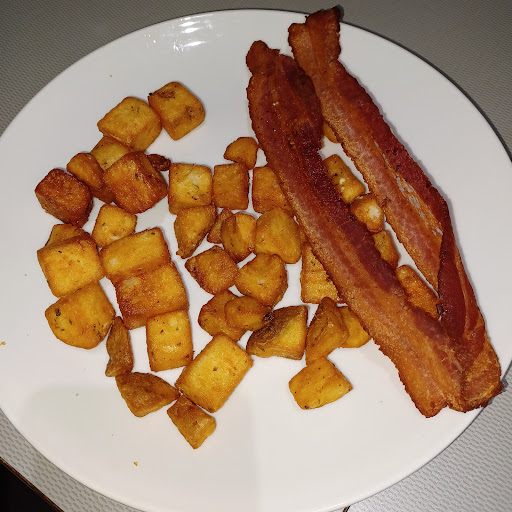 Only slight setbacks? My sausage came out looking rather pale, best way I can describe it. Like you know how typical breakfast sausage arrives a bussin deep golden hue that aches to be dipped in ketchup? Mine arrive pale, like boiled pale. I gave them all to hubby. My Bacon was great. Easy over eggs great. Shredded hash nice portion, something I noticed other places cheap out on. For beverages, I requested water, my hubbs requested coffee. I took a sip of my husband's coffee to see if I made a mistake in not ordering one for myself, it was bitter tasting. Lastly the single orange slice on my plate was visibly dehydrated, so I left it uneaten. Unsure what the limp lettuce leaf was doing under the orange as presentation as well. It could have gone without as observation.