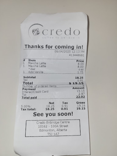 Read moreStopped in for a coffee at Credo on Rice Howard Way—a cozy, modern spot nestled in the heart of downtown Edmonton. Though it’s my first time reviewing this location, I’ve enjoyed their coffee before at The Carrot, where I once volunteered. It’s great to see their quality and consistency carry across locations. We ordered the Americano Misto, served with a lovely motif that made the experience feel extra special. The coffee was smooth, rich, and perfectly balanced—just what we needed for a relaxing break. We’ve included a couple of photos to capture the moment and the beautiful presentation. Credo’s commitment to ethically sourced beans and expertly crafted brews is evident in every cup. The vibe here is relaxed yet vibrant, perfect for a midday pause or a quiet moment to recharge. Friendly baristas and a clean, minimalist space make it a standout among downtown cafés. Whether you're a local or just passing through, Credo is worth the stop. A great cup of coffee with...