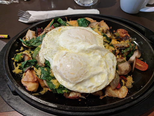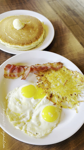 We had the Lumberjack Slam, which was served on two plates. It included buttermilk pancakes, grilled ham, bacon strips, all-pork sausage links, fried eggs, crispy hash browns and toast. It was made to order, and we could choose the cooking method for the eggs.