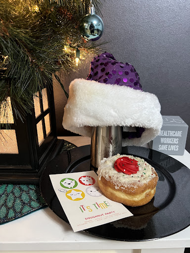 Candy Cane Lane 🎅 - vanilla glazed doughnut, topped with a chocolate drizzle and decorated with festive candy M&M lights