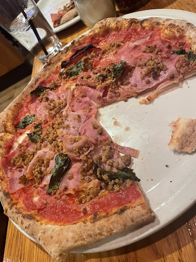 We ordered two Siciliana meat pizzas, no mods. They took well over 35 min to get to us and we were dine in. My pizza was topped very nicely but was SOAKING wet, I was unable to pick up a piece without the slice falling apart and the toppings sliding off. My partner’s pizza was under topped and what there was there was borderline burnt.