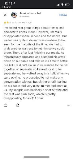 Edit: I read another review and posted it in the pictures where a woman seems to have had a similar experience.. who wants to guess her waiter was Mark too. Hart’s please talk to him about his verbal and non verbal communication towards...