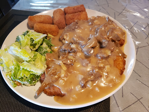 1 order came out with a 1/2 can of mushrooms while the other one came out with fresh ones. Another on came out with pineapple and yes.....Kraft singles. I am German and have had the privilege of eating authentic German cuisine growing up. German schnitzel is something I am very familiar with and what they are trying to pass off as schnitzel is a bit of an insult. The food is very bland and a little salt or pepper might cover up the taste of something that seems to be far from an authentic schnitzel. The verities on the menu are some of the most unorthodox combinations and makes a person wonder if they are grasping at straws or trying to confuse the customers with variety. If they would have taken the time to watch a few cooking shows, they would understand that it's better to have 10 great things on a menu instead of 50+- bland things.